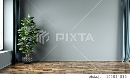 Empty room interior background, blue wall, pot with plant, wooden flooring 3d rendering