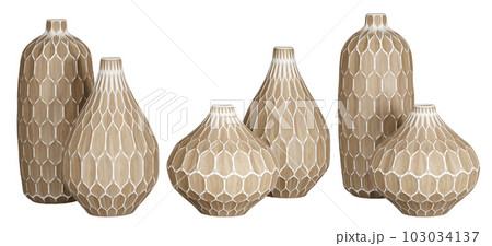 Set of beautifully crafted wooden table or floor vases. Traditional home decor and accents. Home decorative accessories. Isolated interior object. 3d rendering