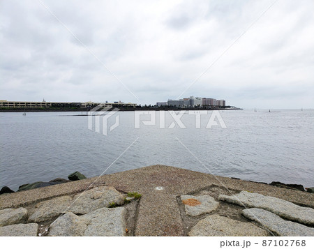 東京灣海濱風景,對岸有混凝土護岸和建築物