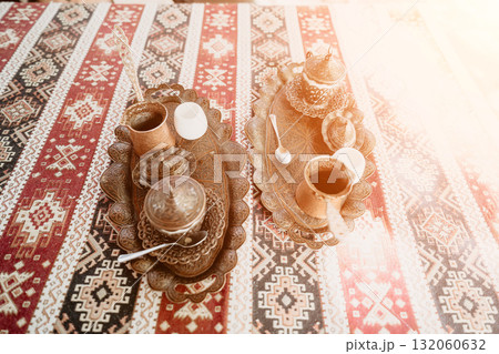 Woman Coffee Turkish Tea Enjoying Traditional Drink in Cafe with Sun Light.