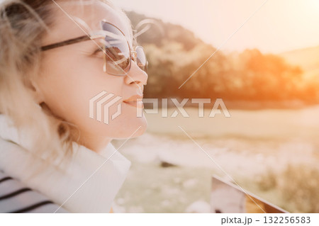 Woman Sunglasses Selfie Mountains Landscape - Happy woman taking a selfie with sunglasses and mountains in the background.