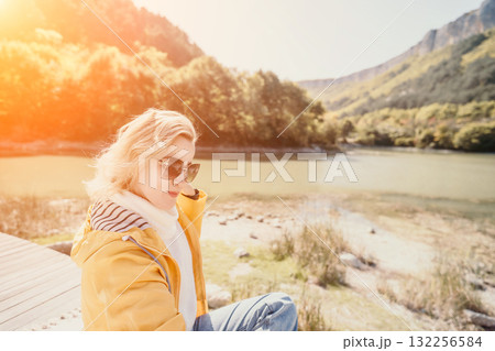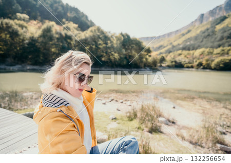 Woman Sunglasses River Hiking - Blond woman wearing sunglasses looks at the camera while enjoying a scenic hike next to a river.