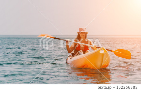 Kayaking Couple Ocean Sunset - Woman paddling kayak with partner on calm sea at golden hour.