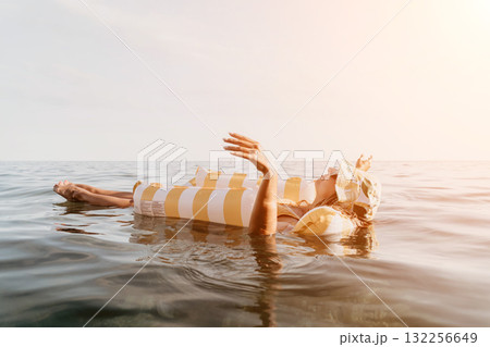 Woman, floating, sea, enjoying peaceful summer vacation on an inflatable donut ring