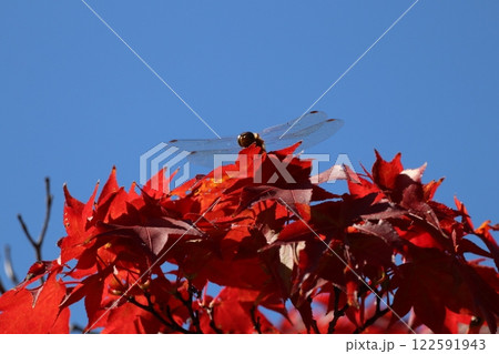 一隻紅蜻蜓停在藍天映襯下的鮮紅楓葉上