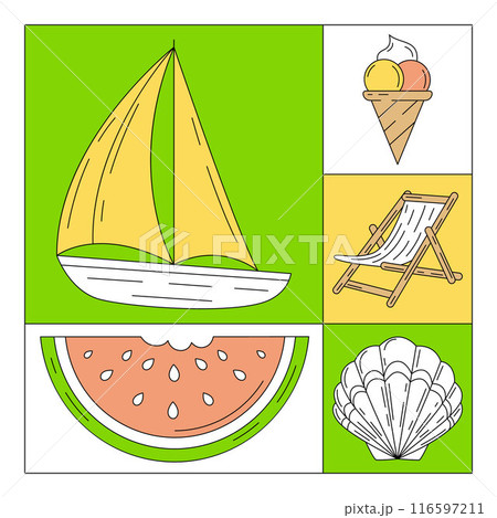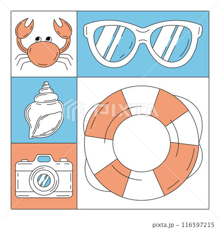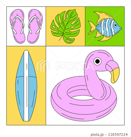 Set of colorful summer beach square card with painted seasonal elements and accessories. Summertime, holiday and vacation concept. For postcard, social media, poster, banner, invitation or flyer