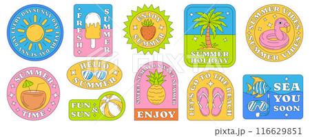 Summer beach retro funky flat stickers set. Simple icons with seasonal elements, fruit, slogan or quotes. Groovy summer vector illustration, sticker pack or collection of badges isolated on white