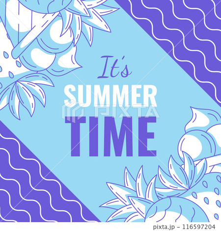 Summer beach square card, vector minimalist design with bright monochrome pineapple, ice cream, strawberry. Geometric shapes, wavy lines. For postcard, social media, poster, banner, post, invitation