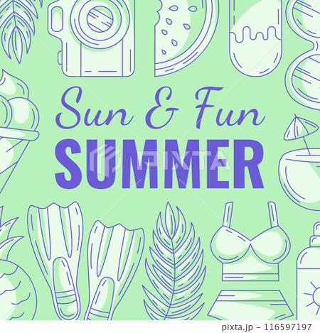 Summer square card with beach accessories icons. Top border frame and copy space, isolated on white. Summer vibes, enjoy every moment. For poster, flyer, banner, invitation, social media