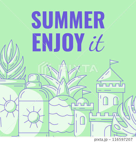 Summer beach square card with seasonal elements and accessories. Sunscreen, pineapple, sand castle, tropical leaf. Summertime concept. For postcard, social media, poster, banner, invitation or flyer