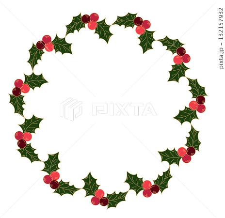 Christmas holly wreath with berries, decorative border doodle style isolated on white background