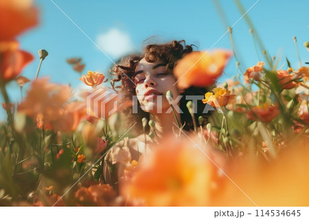 A girl in a field with flowers.