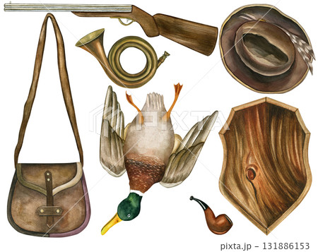 Hunting kit. Hunter's bag, rifle, hat, bugle, dead duck, oak shield, smoking pipe. Watercolor illustrations. Hand-drawn. Isolated on white background