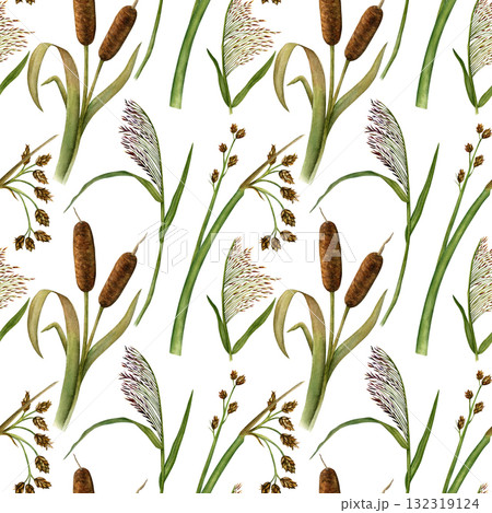 Seamless pattern of cattail, reed and rushes. Hand-drawn watercolor illustration. For textiles, fabrics, and wallpaper