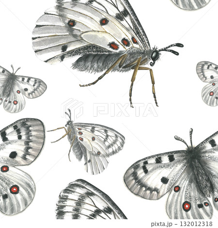 Seamless watercolor pattern of red berries rose hips and white butterfly apollo isolated on white background handdrawn