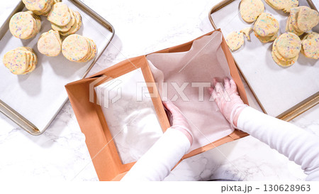 Flat lay. With precision, the woman is carefully arranging the sugar cookies, filled with dough-mixed sprinkles, into a rustic brown paper box.