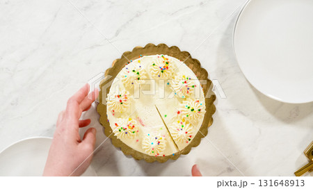 A hand places a slice of sprinkle-topped vanilla cake with white frosting onto a white plate. The rest of the cake remains on a gold base on a white marble surface under bright lighting.