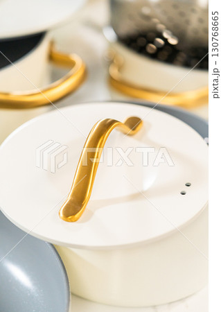 A white ceramic pot with a gold handle is viewed from above on a marble surface. Another pan is partially visible next to it.