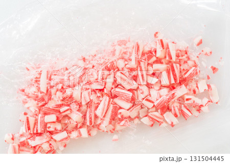 A close-up view of crushed candy canes scattered on a plastic bag, showcasing finely chopped red and white pieces for baking preparation. The perspective emphasizes texture and detail.