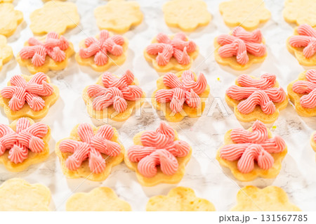 Rows of flower-shaped cookies piped with raspberry buttercream are lined up for assembling Easter Cookie Sandwiches with Raspberry Buttercream.