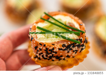 A top down view of a person holding a plate of smoked salmon canapes arranged on gourmet crispbread topped with cream cheese fresh herbs and lemon zest. The elegant appetizer is beautifully presented