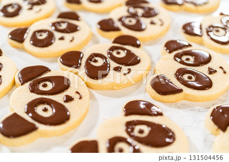 Overhead view of a batch of panda cookies with completed chocolate icing designs for the Chocolate Royal Icing Recipe. Each cookie features a cute panda face, giving a uniform and adorable look.