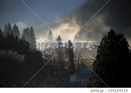 山村、色彩繽紛的樹木、落葉樹,以及一條鐵路,霧氣在針葉林間升騰。