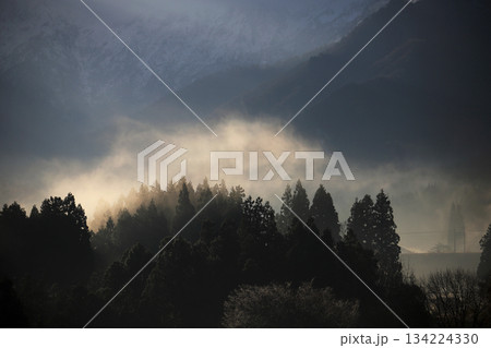初冬時節的山區。山脈上覆蓋著一層薄薄的積雪。霧氣籠罩著針葉林。遠處右側可以看到一條鐵路。
