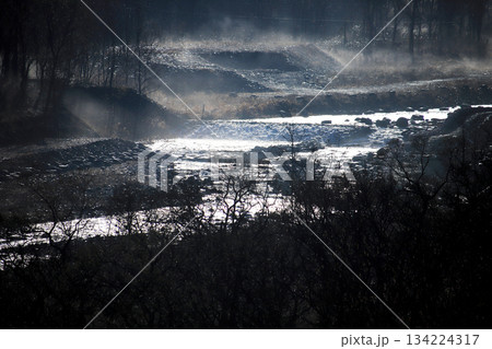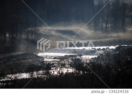 河岸瀰漫著薄霧,針葉樹勾勒出奇特的輪廓。