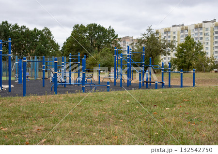 Open-air city sports ground with outdoor exercise equipment. Sports complex in a residential area.