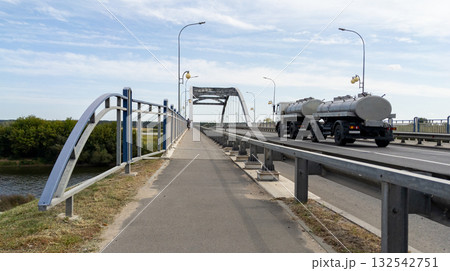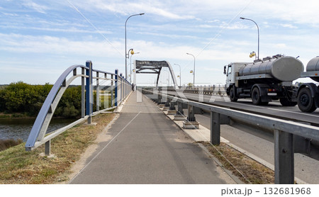 Milk tanker with a tank trailer travels along a highway over a bridge over a river. Concept for delivering milk from dairy farms