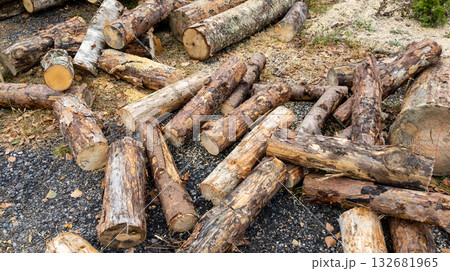Sawn pine logs lie on the ground. Close-up of tree trunks. Deforestation concept.