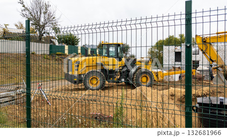 Mobile crane and telescopic handler in the background at construction site against the background of the frame of the building under construction