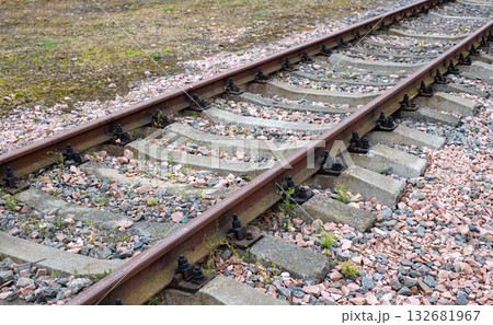 Empty railroad track under a blue sky, from left to right. Railroad lines. Close-up of railroad tracks, metal rails, railroad track.