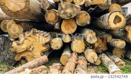 Freshly cut pine logs stacked outdoors, showcasing natural wood texture, forestry and logging industry scene