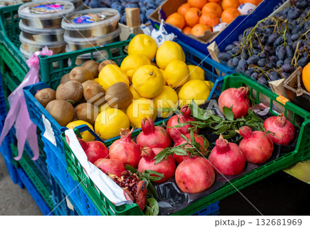 Pomegranates, lemons, kiwis, and grapes on display at a street market. Street vendors sell their fruits
