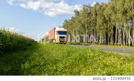 Two Yellow Trucks Driving on Highway Through Forest Landscape and Field