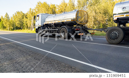 White milk tanker with drives along a highway through a forest landscape in summer. Delivery of milk from farms to the dairy plant.