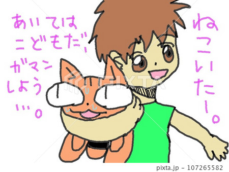 一隻大眼睛的貓抱著一個孩子