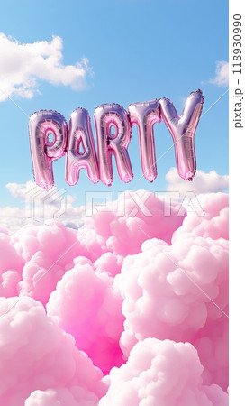 The word Party from helium balloons is on blue sky and pink clouds background. copy space