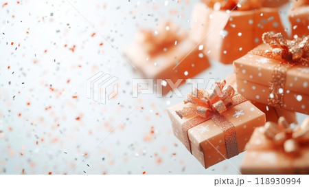 gift boxes with confetti falling or flying in motion. copy space
