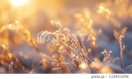 Glazed ice on the branch plants. Hoarfrost on the leaves of grass. Amazing cold and warm feel from the color.