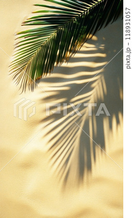 Palm branch and light near yellow wall, space for text. Summer party