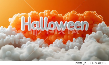 The word Halloween from helium balloons is on orange and white clouds background. copy space