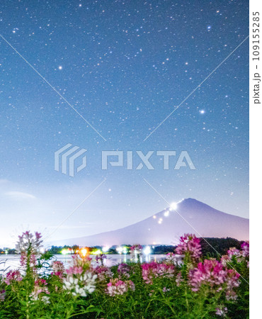 天空中的星星,河口湖和富士山上綻放的克萊姆
