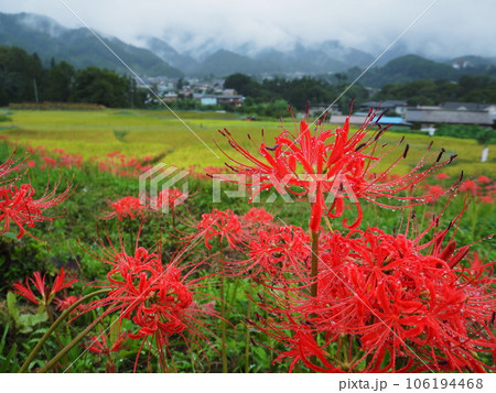 在水稻梯田中綻放的簇狀孤挺花