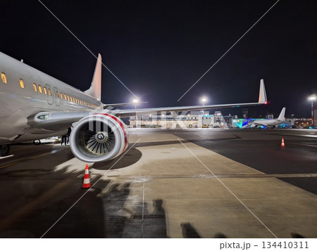 Airplane jet waiting to runway on taxi lane in airport. Night time. Airplane wing.