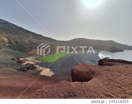 Lanzarote volcanic Lake and ocean beach in El Golfo, Canary Islands, Spain. Charco de los Clicos