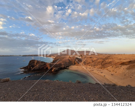 Papagayo Beach, Lanzarote: A stunning beach with golden sand, turquoise waters, and secluded coves. Cloudy sky. Evening time. Lanzarote island