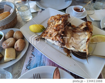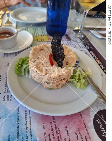 Close up of tasty big piece fried fish with potato and sauce from tomato and chili re paper. Delicious restaurant food near ocean in Spain, Canarias island. Traditional Canarias dish.